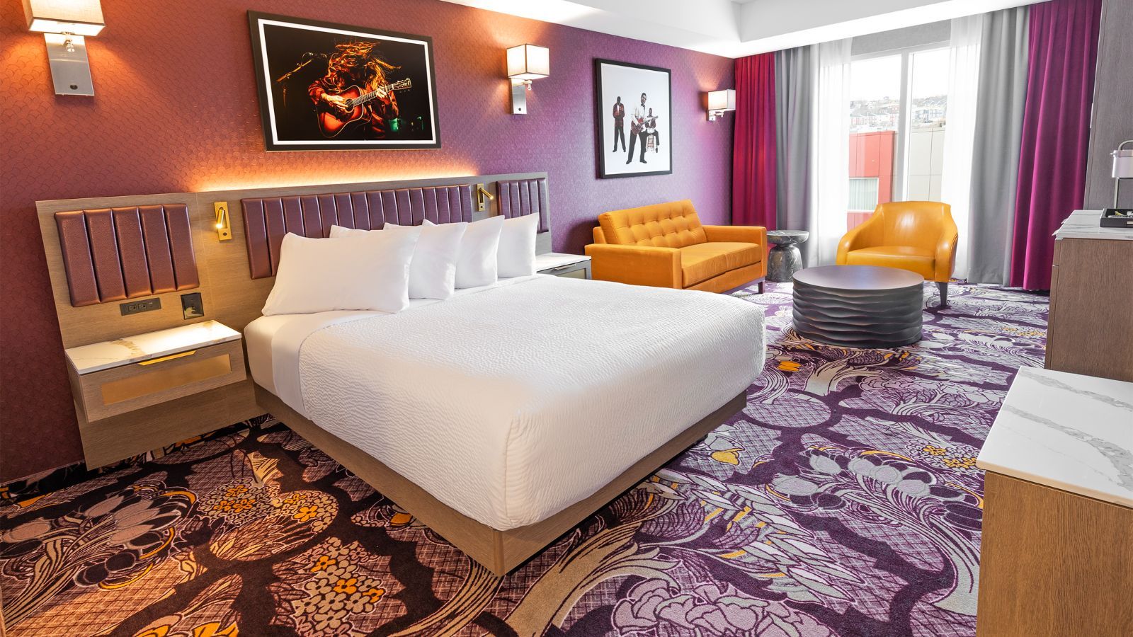 Perfectly in tune with comfort and style, this room features a queen-size bed, sleek furnishings, and modern amenities. A comfortable sofa adds extra space to relax, making this room a cozy retreat whether you’re here for business or leisure.