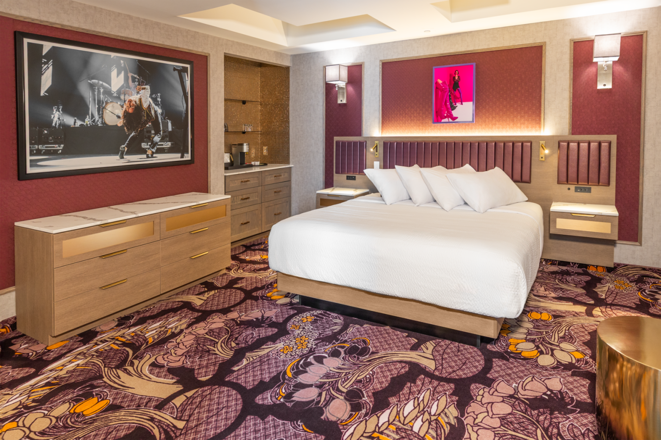 The JAG Suite blends style and comfort in a spacious setting. Featuring one king-size bed, a separate seating area with a sofa and two chairs, and a full bath with a sleek shower, it’s the ultimate retreat for relaxation and luxury.